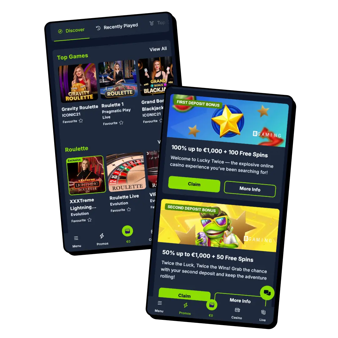 Our mobile software for Android and iOS has intuitive navigation and an interactive user interface. Also, it’s designed to be fast so that you can quickly load and play games, including live dealer titles, on the go. Similarly, you’ll find secure ways to make payment through methods like VISA and MasterCard credit and debit cards, Bank Transfer and many popular cryptocurrencies. With the Lucky Twice Casino application, you can also customise your settings to receive push notifications for any of our casino offers, activate bonuses and participate in tournaments.