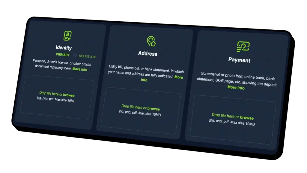 | Identity/Selfie ID | Upload a passport, driving licence or any other government issued photo ID with DOB, picture and other details showing clearly or upload a selfie with your means of identity in your hands. |