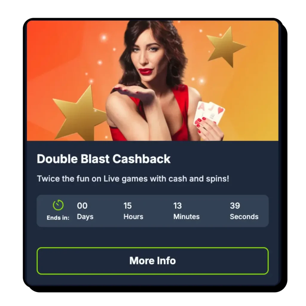- Double Blast Cashback – Opt-in every Thursday by playing live games and wager between £500 and £25,000+ to get up to 25% cashback plus 10 free spins.