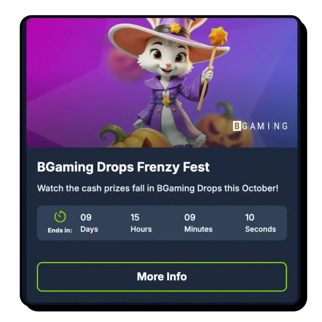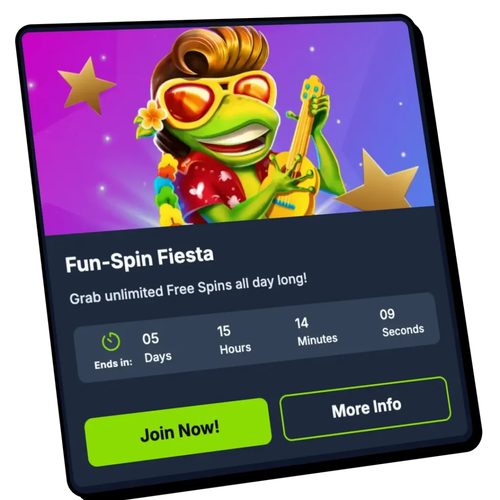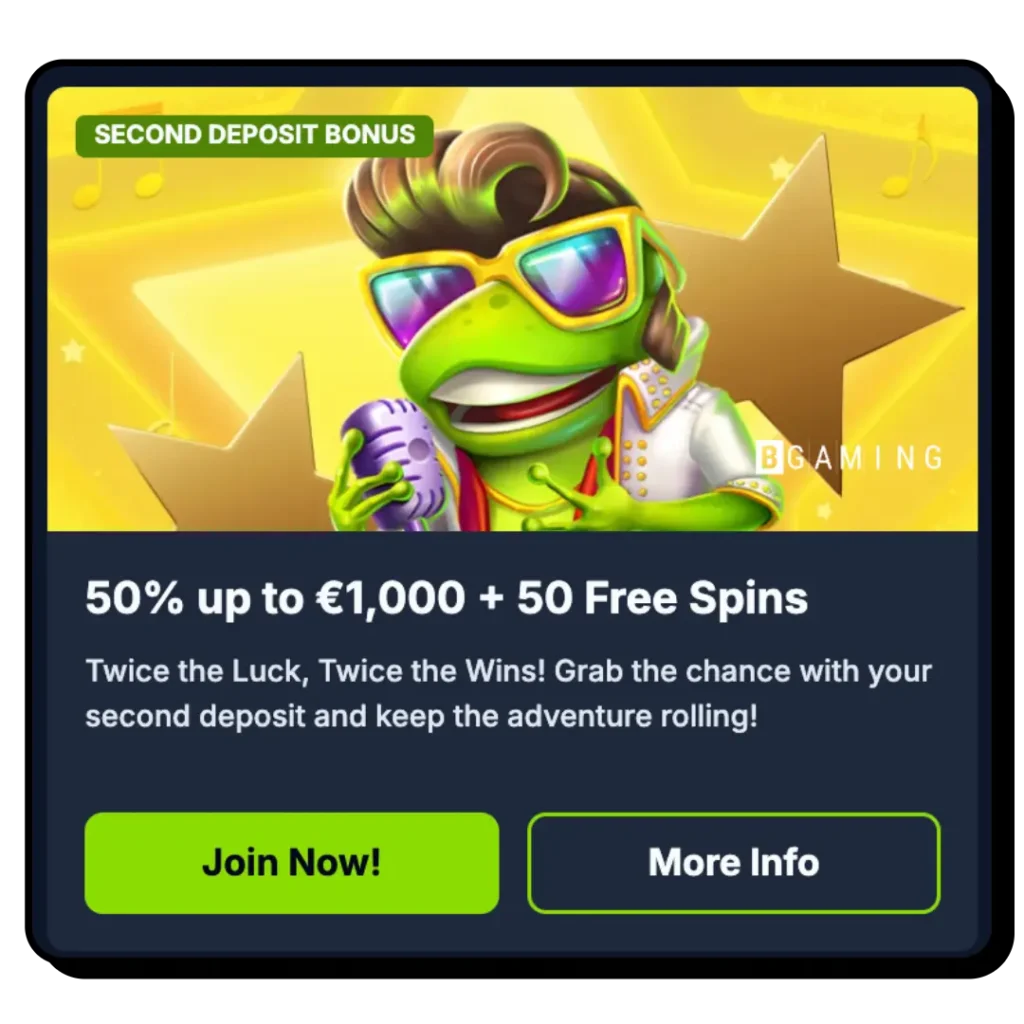 | Second Deposit | Get a 50% bonus up to £1,000 and 50 free spins, awarded on Elvis Frog in Vegas. Use the Lucky Twice bonus code “TWICE2” to claim the reward. |