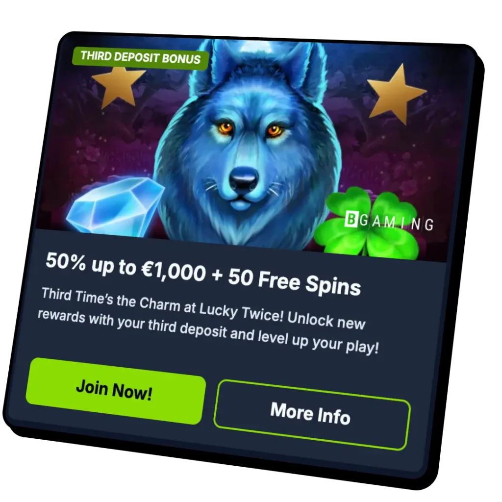 | Third Deposit | It comes with 50% up to £1,000 + 50 free spins. Use “TWICE3” when depositing to get FS for Lady Wolf Moon. |